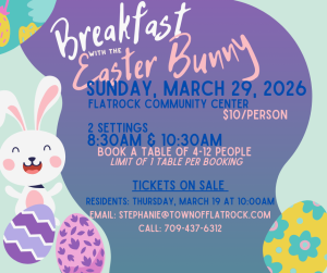 Tickets for Breakfast with the Easter Bunny go on sale on Thursday, March 19, 2026 for residents only at 10:00am. Email stephanie@townofflatrock.com or call the office at (709)437-6312.